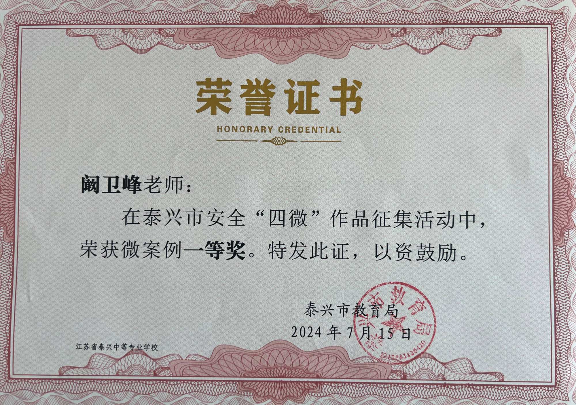 在今年的泰兴市安全教育“四微”作品征集活动中,建筑系阚卫峰老师获得微案例一等奖,徐国荣老师获二等奖,同时顾海洋老师获得微剧二等奖。