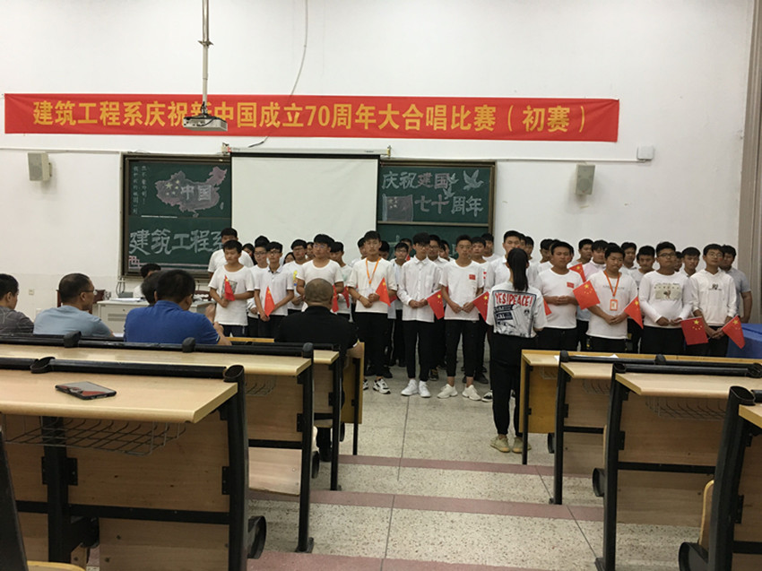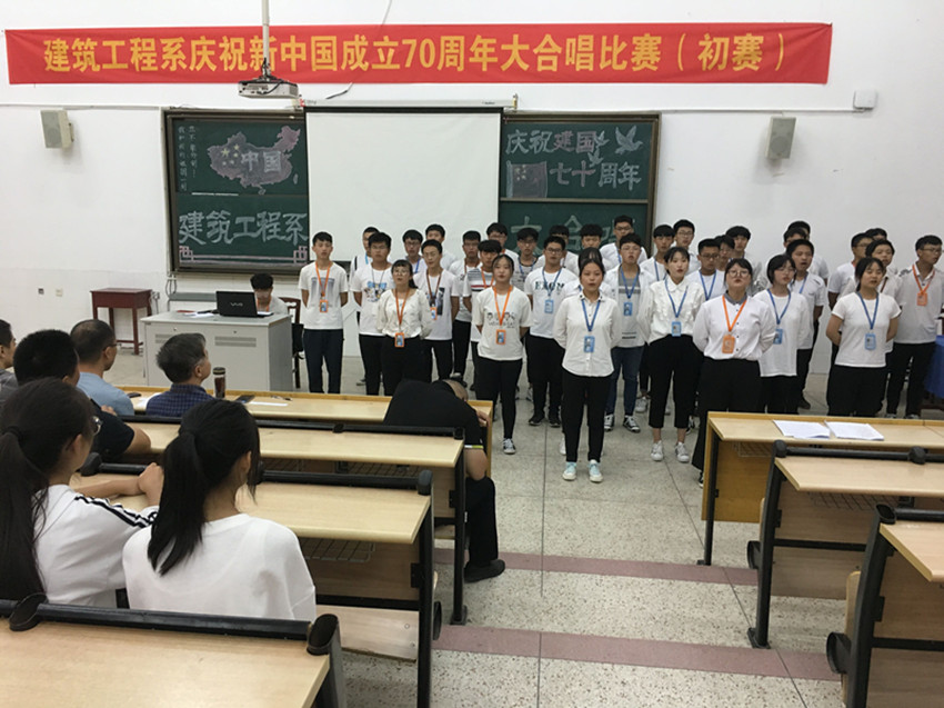 2019年9月29日,为庆祝新中国成立70周年,深入贯彻习近平新时代中国特色社会主义思想和党的十九大精神,进一步丰富校园文化生活,构建积极向上健康文明的校园氛围,建筑工程系举办“庆祝新中国成立70周年”合唱比赛。 本次参赛共有10个班级,经过两个多小时的激烈角逐,最终比赛结果如下: 一等奖 : 17建工联五 二等奖 : 16建工联五、19施工(3+3) 三等奖 : 18建工联五、17施工造价、19施工造价