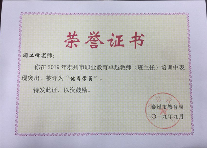 为贯彻落实全市教育大会精神,加快构建泰州卓越教育体系,加强新时代泰州市职业教育卓越教师队伍建设,9月21日至22日,建筑系阚卫峰老师参加了在泰州实验学校举办的泰州市职业教育卓越教师(班主任)培训会。 在培训中,阚卫峰老师积极参加了“我的教育故事”演讲和模拟教育情景答辩,表现出色,得到现场指导专家的好评,获得“优秀学员”的称号。