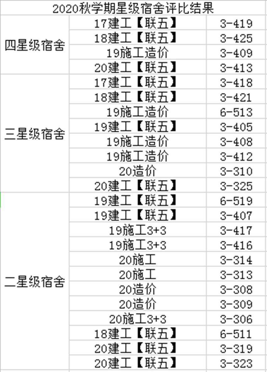 为培养学生的综合素质,营造好舒适的学习环境,1月5日下午,建筑系在阶梯教室开展星级宿舍的评比活动,在全体学生的努力下,宿舍桌面、地面、阳台干净整洁无杂物。一批优秀的宿舍已经产生,现将评比结果公示如下: