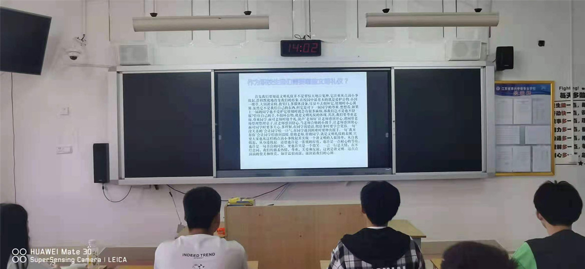 最后,大家一起欣赏了以文明为主题的一系列照片,如上下楼梯靠右行、不乱扔垃圾等,看完以后大家都深受触动,陷入了沉默。回想我们的日常,在楼梯上追逐搞打,随手乱扔垃圾等行为时有发生,而这些陋习恰恰也是老师们时长告诫我们不应该出现的。这些不文明行为的发生,足以反应学生们日常文明意识的缺失。循文明礼仪是中华民族的优良传统和作风,我们应该继承下去。大家纷纷自发表示,以后要自觉革除各种不文明行为和不良陋习,提高文明素质,尽显礼仪之风。
