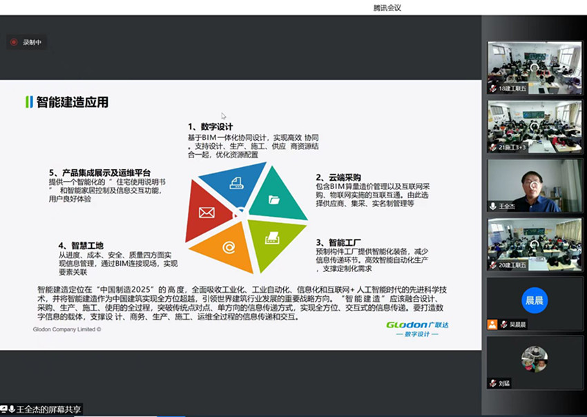 为开拓学生视野、提升学生的创新意识和培养学生以学为乐、学以致用的能力,4月14日,建筑系有幸邀请到广联达公司高级工程师王全杰先生为我们作“建筑科技成就职业人生”专题讲座。王全杰先生是广联达软件股份有限公司副总经理,高级工程师,王全杰专家从智能建造是建筑业的发展趋势以及智能建造的现状与发展、建筑行业新科技如何助力建筑专业新教育三方面为我们作了一个内涵深刻、内容丰富、别开生面的讲座,同学们通过这次线上视频讲座收获颇多。