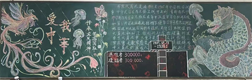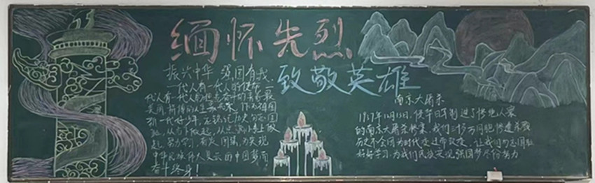 每个班级学生都描绘出对南京大屠杀死难者和遭受日本侵略者杀戮的中华同胞的缅怀,也向时代展示出不忘历史,珍惜和平,牢记使命。为中国富强和民族振兴交出一份答卷。