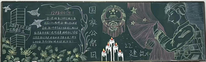 30万一个让无数中国人心义愤填膺的数字,12月13日一个值得每个中华同胞用一生去铭记的日子,几十年前日本侵略者对南京犯下了不可饶恕的罪行,无数的革命先烈和民族英雄献出生命,作为“新时代青年”缅怀那些英灵,建筑系近期开展了国家公祭日黑板报比赛。
