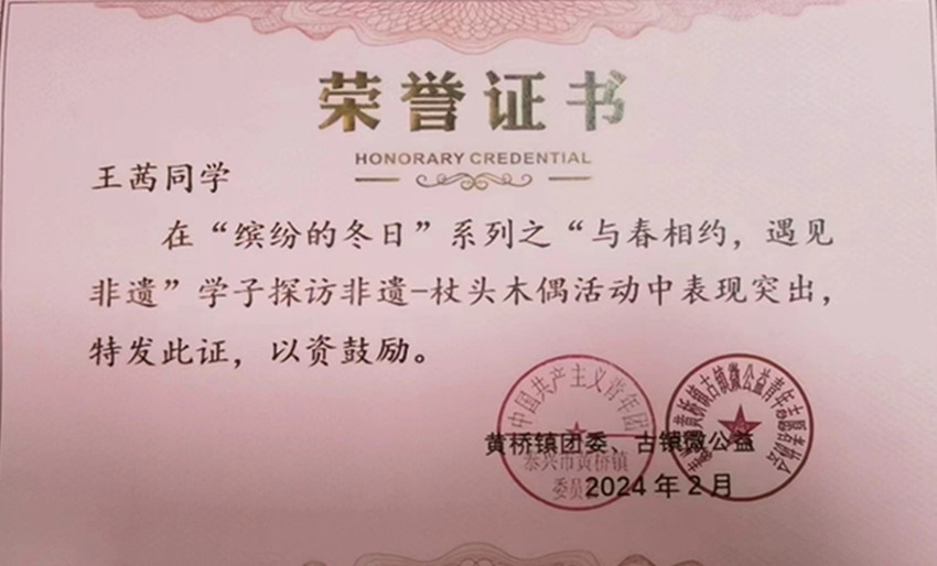 参与文化实践活动,做文化小达人。我校王茜同学利用假期时间参与了“与春相约,遇见非遗”学子探访非遗——杖头木偶传统文化实践活动,积极学习、传承和弘扬中华优秀传统文化,坚定文化自信。