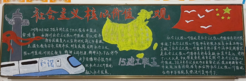 2018年9月18号,我系组织开展了第一期以“社会主义核心价值观”为主题的黑板报评比活动。经过系团总支和学生会认真评比,共评出一等奖1名,二等奖2名,三等奖3名。 一等奖: 16建工【联五】 二等奖: 15建工【联五】 18建工【联五】
