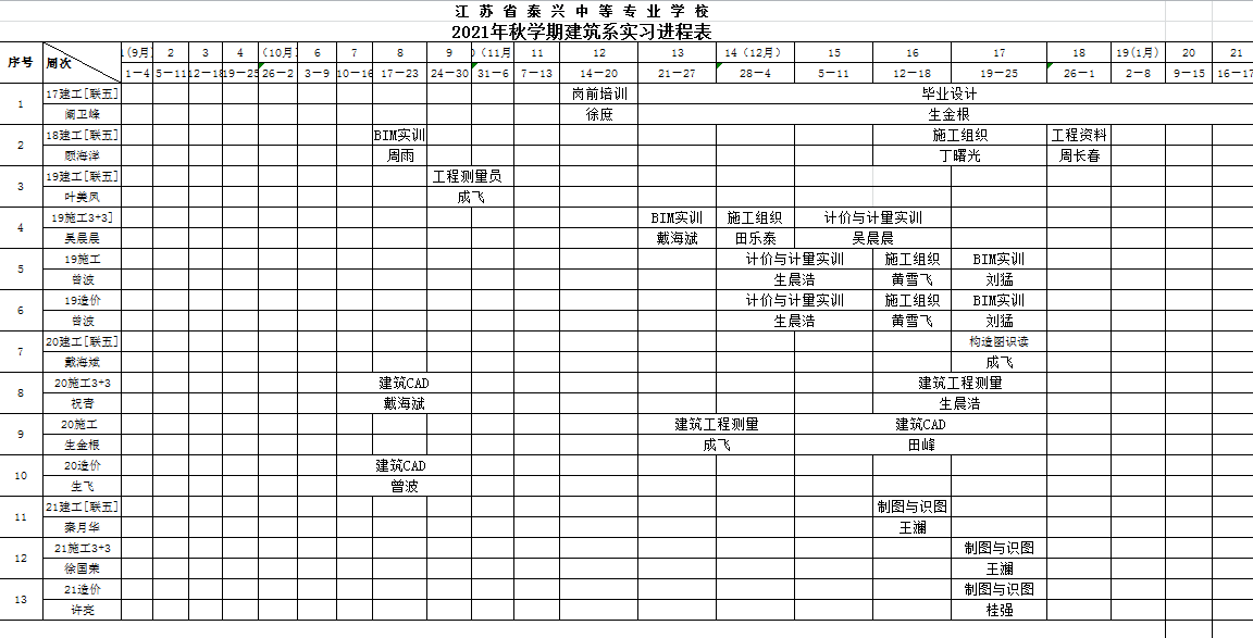 2021年秋学期建筑系实习进程表