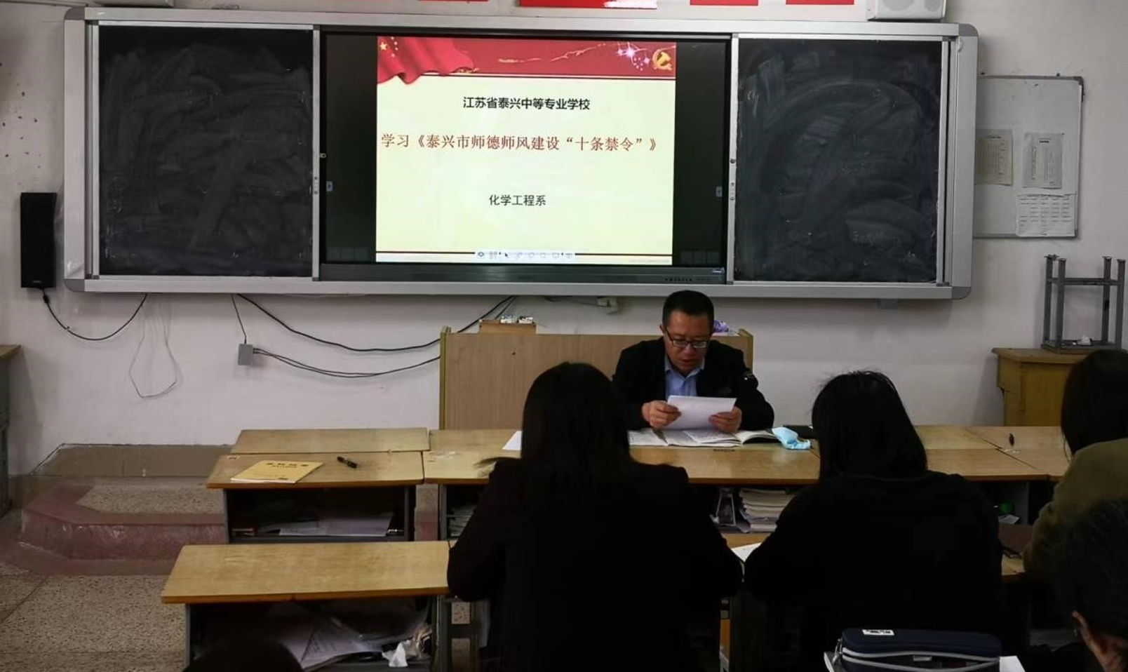 2022年4月25日,化学工程系在2号楼306室召开全体教职工会议,学习《泰兴市师德师风建设“十条禁令”》。