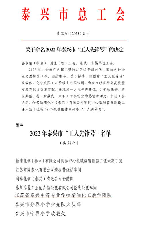 我校精细化工教学团队被命名泰兴市“工人先锋号”