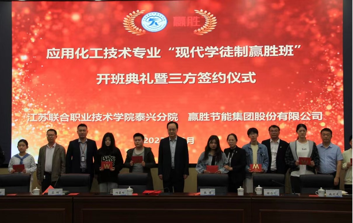 2023年10月12日下午,“现代学徒制赢胜班”开班典礼暨三方签约仪式在知行厅举行。赢胜节能集团股份有限公司总经理张君、研究院院长谢存剑、人力资源部经理秦梦瑶,我校校长何晨阳、副校长苏辉、化工系马太平主任、朱岳副主任、学生管理服务中心施文龙主任,“赢胜班”全体学生及家长等参加了签约仪式。典礼由苏辉副校长主持。