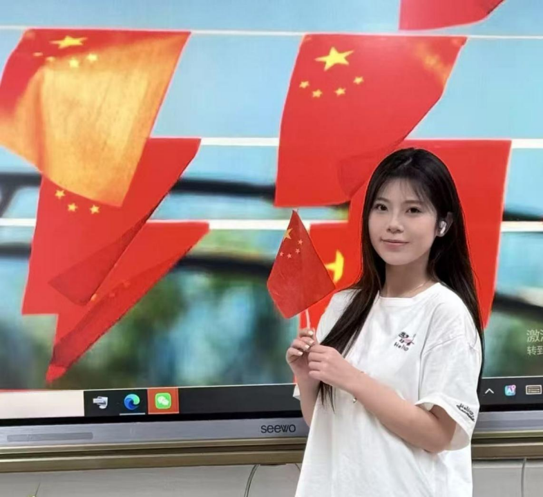 教学楼里,同学们以黑板、课桌为背景,手执鲜艳的五星红旗,绽放出青春的笑容。同学们说:“教室是我们学习成长的地方,在这里与国旗合影,更让我们意识到青年一代的责任与担当。”