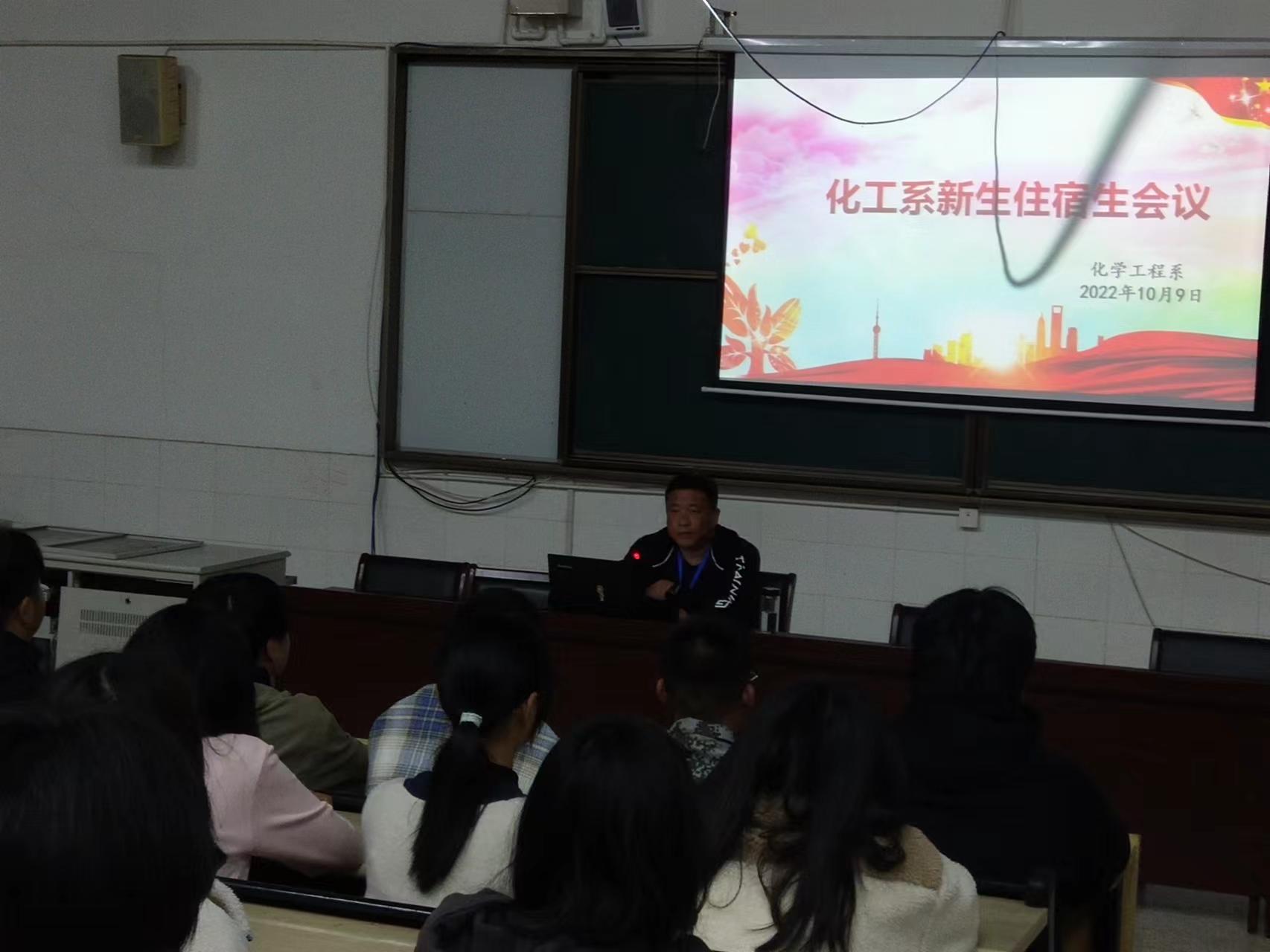 2022年10月9日晚,化学工程系在阶梯教室召开了全体新生住宿生大会。系部副主任朱岳向全体学生通报了9月30日宿舍检查情况,并对宿舍作息时间、宿舍纪律、安全制度、卫生制度、违纪及处罚制度、宿舍内务标准等进行了详细讲解,特别强调了高空抛物、垃圾袋拖行、堵塞下水管道等不文明行为的危害。