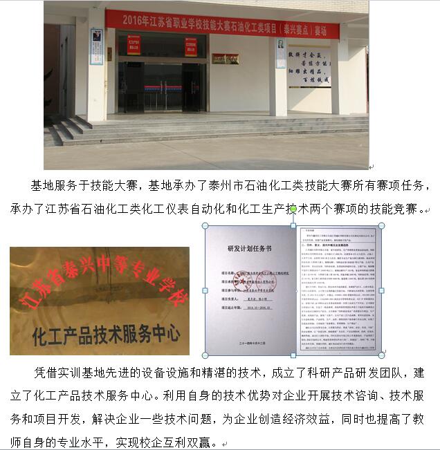 与泰兴市银鑫化工科技有限公司合作建设中试多功能车间,企业提供场所和技术人员,政府配套提供资金201.32万元购置了相关设备,既解决了学生的实训实习,又能取得良好的社会效益。很好地完成了高水平示范性实训基地的建设任务。