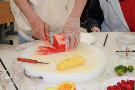 活动期间,同学们分工合作,有的清洗工具,有的分水果,有的负责调制,每一杯水果茶都凝结着同学们的智慧,充分培养了学生们的创新力和审美力。