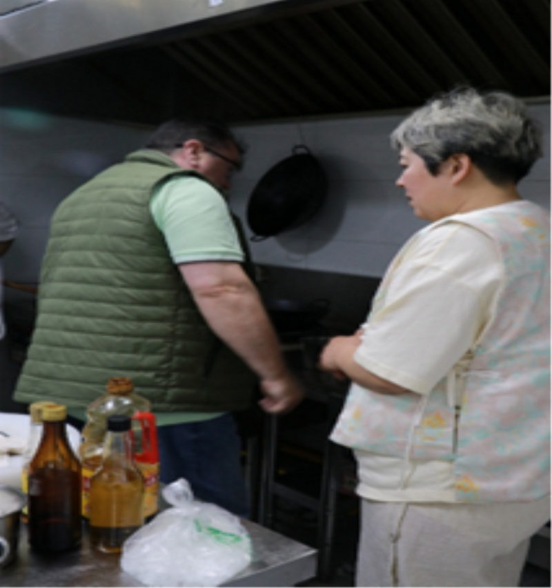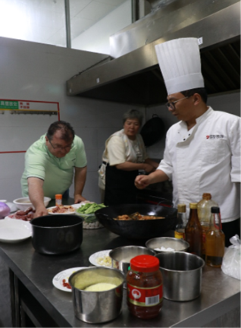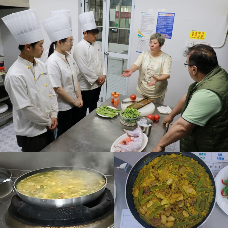 在互动环节,Carlos夫妇对中式炒锅的灵活运用及“爆炒”技法表现出浓厚兴趣,而师生们则围绕西班牙藏红花、烟熏红椒等特色调料展开提问。双方就“地域食材与菜品创新”、“传统技艺的现代化表达”等话题深入探讨。