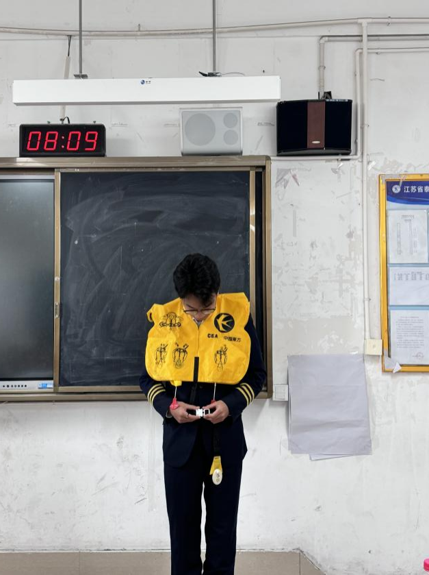 学生拿起救生衣,动作流畅地为大家展示穿着方法。“将救生衣套在头上,然后拉紧两侧的带子。”边说边操作,还特别提醒:“不要提前充气,以免在客舱内行动不便。”讲解细致入微,让人一下就记住了要点。