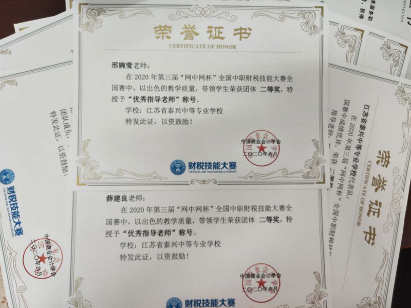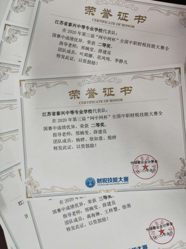 2020年6月15日部分学生参加了2020年第三届“网中网”全国中职财税大赛。我系邢婉莹老师和薛建良老师在此次比赛中荣获优秀指导老师称号。我系两组学生(殷婷、徐如意、杨婷)(范凤鸣、叶莉娜、李静凡)在此次比赛中分别荣获团体二等奖,一组学生(徐茜、王梓慧、蒋海琳)荣获团体三等奖。