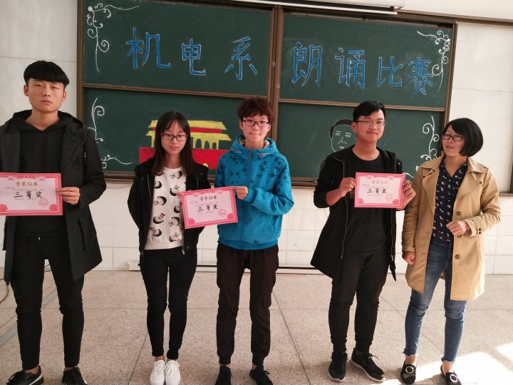 为庆祝建国六十八周年,加强对学生的爱国教育,增强学生的民族自豪感和荣誉感,丰富校园文化生活,拓展学生视野,展现学生风采,锻炼学生能力,激发师生的爱国热情,我系于10月13日上午1号楼阶梯教室举办了“祖国,我为您骄傲”主题朗诵比赛,共有20名选手参与角逐,比赛中,选手们声情并茂,充满激情,或慷慨激昂,或低沉婉转,或抑扬顿挫,一首首激情澎湃、感人至深的诗歌,展现了对祖国的真挚情感, 本次比赛取得了圆满成功,现将比赛结果通报如下: 一等奖:吴雅倩、蒋 贝(15电子联五) 二等奖:匡杰林、 戴 杰(17机电联五) 季 毅 ( 17轨道交通) 三等奖:黄若曦、王雨晴(15动漫、15城市轨道) 戴辛材(17机电联五) 于勇琪(16机电联五)