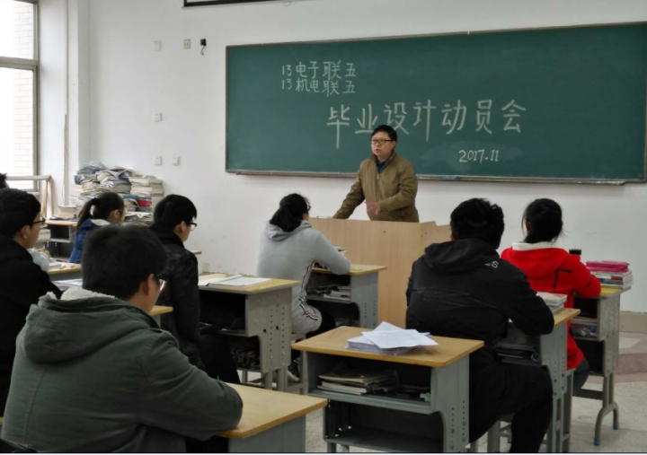 2017年11月16日上午,机电工程系在1号教学楼503室召开了13级电子信息工程技术、机电一体化技术两个专业学生的毕业设计动员会。动员会由班主任周建平老师主持。系部周伯生副主任进行动员,讲了三点要求。一、明确做好毕业设计工作的意义、目标;二、按照毕业设计安排表的时间节点完成好各项设计任务;三、合理安排好毕业设计工作和专转本复习工作之间的时间,争取两项任务都能取得好成绩。最后,班主任马留婉老师介绍了毕业设计分组及指导教师情况,对毕业设计工作提出了明确要求。