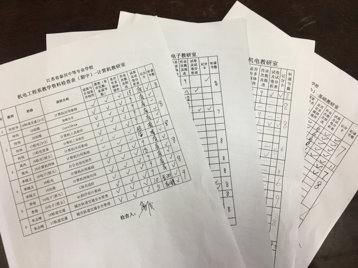 11月9日下午,机电工程系组织系部教研室主任对所有老师的教学资料进行了检查,检查分基础教研室、电子教研室、机电教研室、计算机教研室四组,从教学进度与计划是否相符、教案的备课节数及完整性、是否运用多媒体技术、作业及作业批改、听课情况、期中考试情况等方面逐项进行,并认真填写检查记录,将存在的问题与相关老师及时沟通,通知立即进行整改。 ![]()