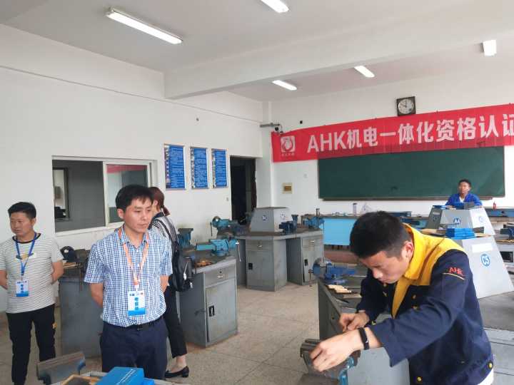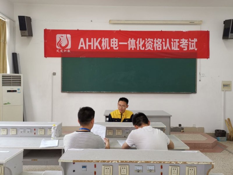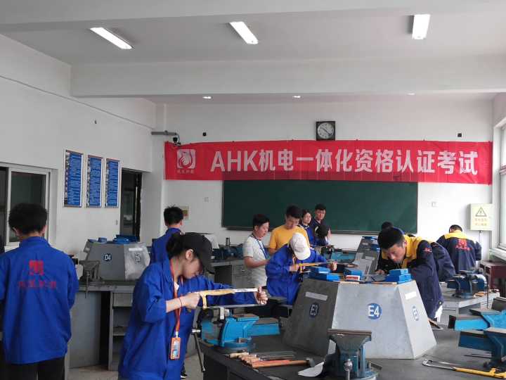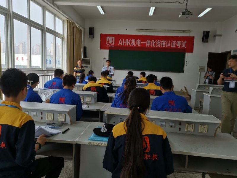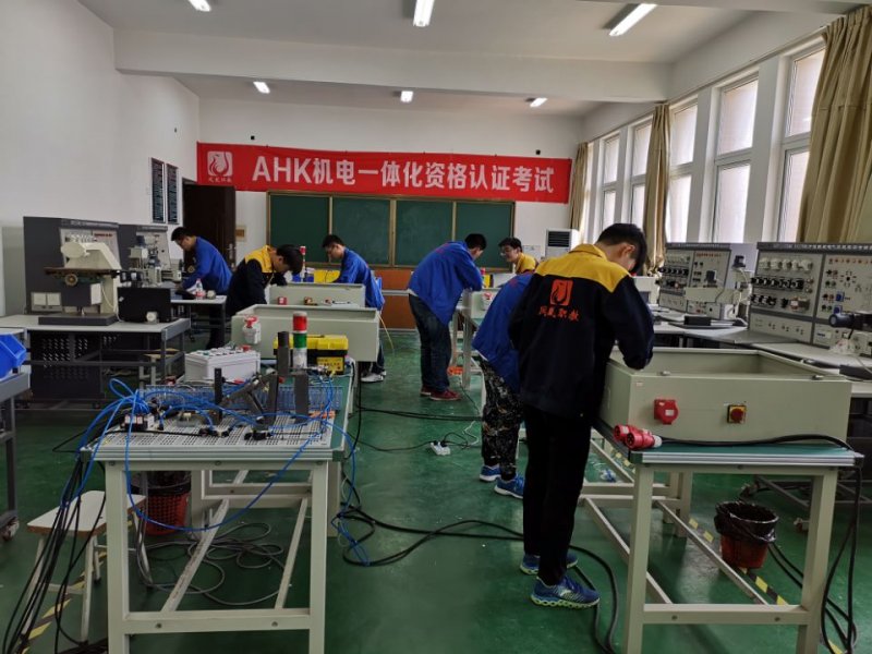 2019年6月21日至6月23日,16级AHK班级的学生经过三年的学习训练迎来了AHK机电一体化师中期考试。考前系部召开了AHK考试专题会议,制定了详细的考试安排表,与凤凰集团、有关商会进行了联系,确定了第三方监考人员,安排老师对机械考场、电气考场、理论考场及备考场所进行了整理准备。6月21日上午8时,全体学生参加了理论考试,然后分十三批经过两天半时间进行了实践操作考试。16级机电班学生AHK机电一体化师中期考试圆满完成。 学生进行理论考试: