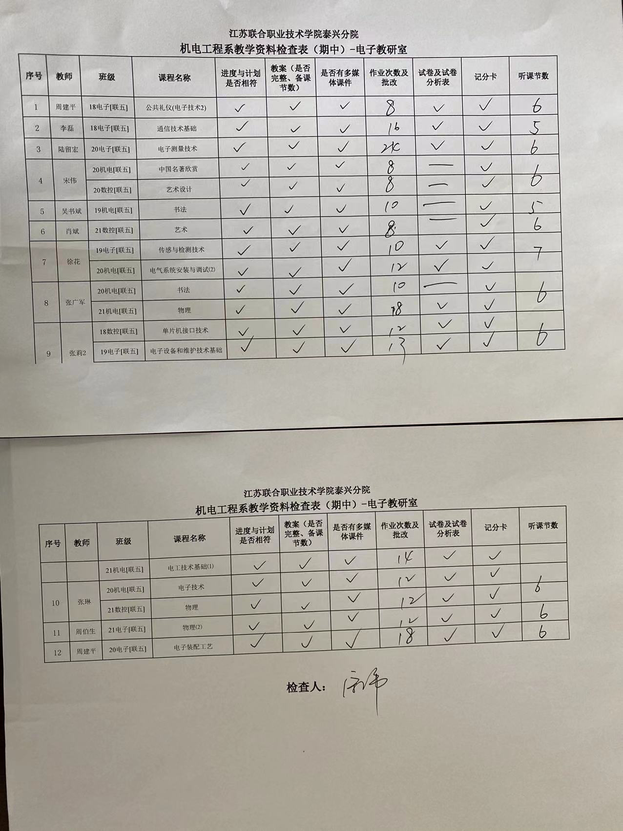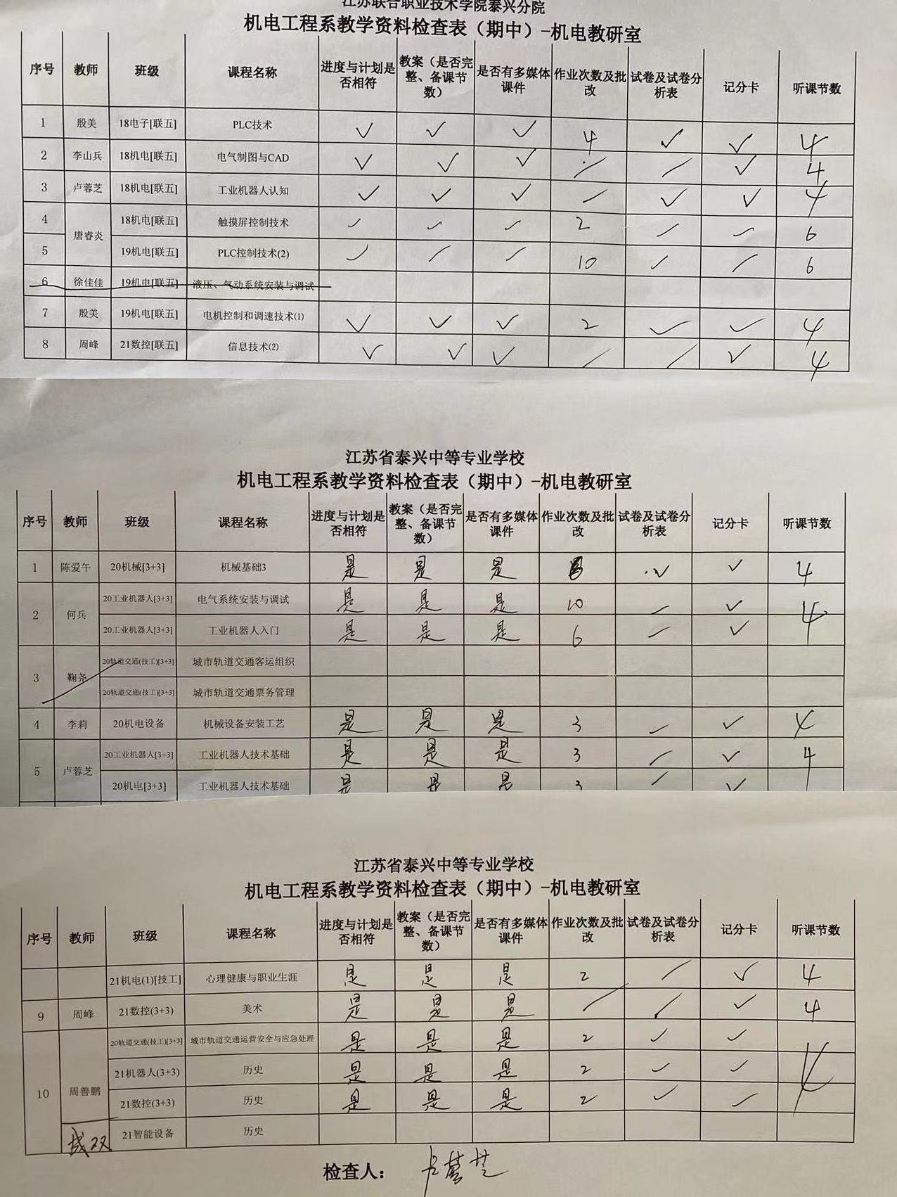 为强化教学常规管理,规范教师教学行为,提高人才培养质量,机电工程系于2022年4月20日组织五个教研室主任对系部本学期老师的教学情况进行了系统检查。逐一检查了老师的授课计划、备考笔记、学生作业、听课笔记、多媒体课件等教学资料;将实际授课情况与授课计划进行了比对。对检查中发生的问题及时与有关老师进行了沟通、整改。