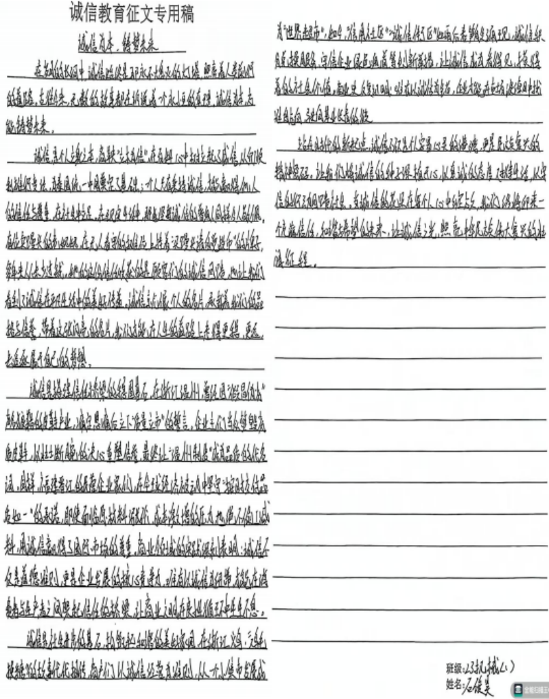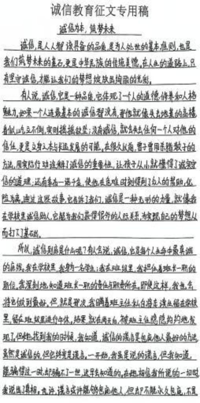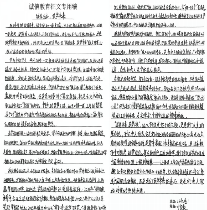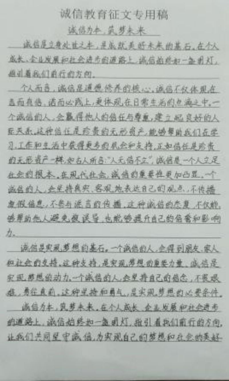 为深入贯彻落实习近平新时代中国特色社会主义思想,弘扬社会主义核心价 值观,加强校园诚信文化建设,培养学生的诚信意识和道德素养,引导学生树立 正确的价值观和人生观,营造诚实守信的校园氛围,机电工程系 5 月 26 日举办 “诚信为本,筑梦未来 ”诚信教育主题征文比赛。