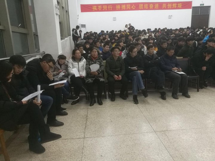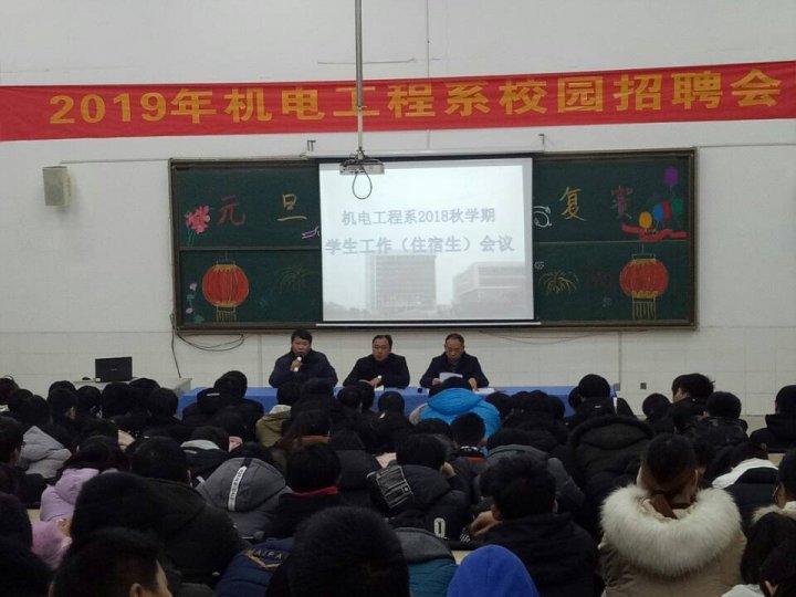 2019年1月14日晚上7点,我系在1号教学楼阶梯教室召开所有班主任、值班人员和住宿生会议。会议由王金如副主任主持。 首先,学生科吴书斌科长针对这学期住宿生存在的问题从五个方面进行了总结并提出了具体的应对措施,同时对班主任工作提出了四个方面的要求。 王金如副主任重点从正确、合理、高效利用时间和团结、阳光、有效提升能力两个方面对住宿生做了补充要求,同时要求班主任认真学习“机电工程系2018年秋学期期末学生管理工作安排及要求”的相关内容,做到“全天候管理,全方位督查”,确保学生文明、安全、有序离校。 最后,陈爱午主任用“新、信、行”三个字,从三个方面以案例形式对存在的问题、取得的成绩和来年的希望进行了总结发言。