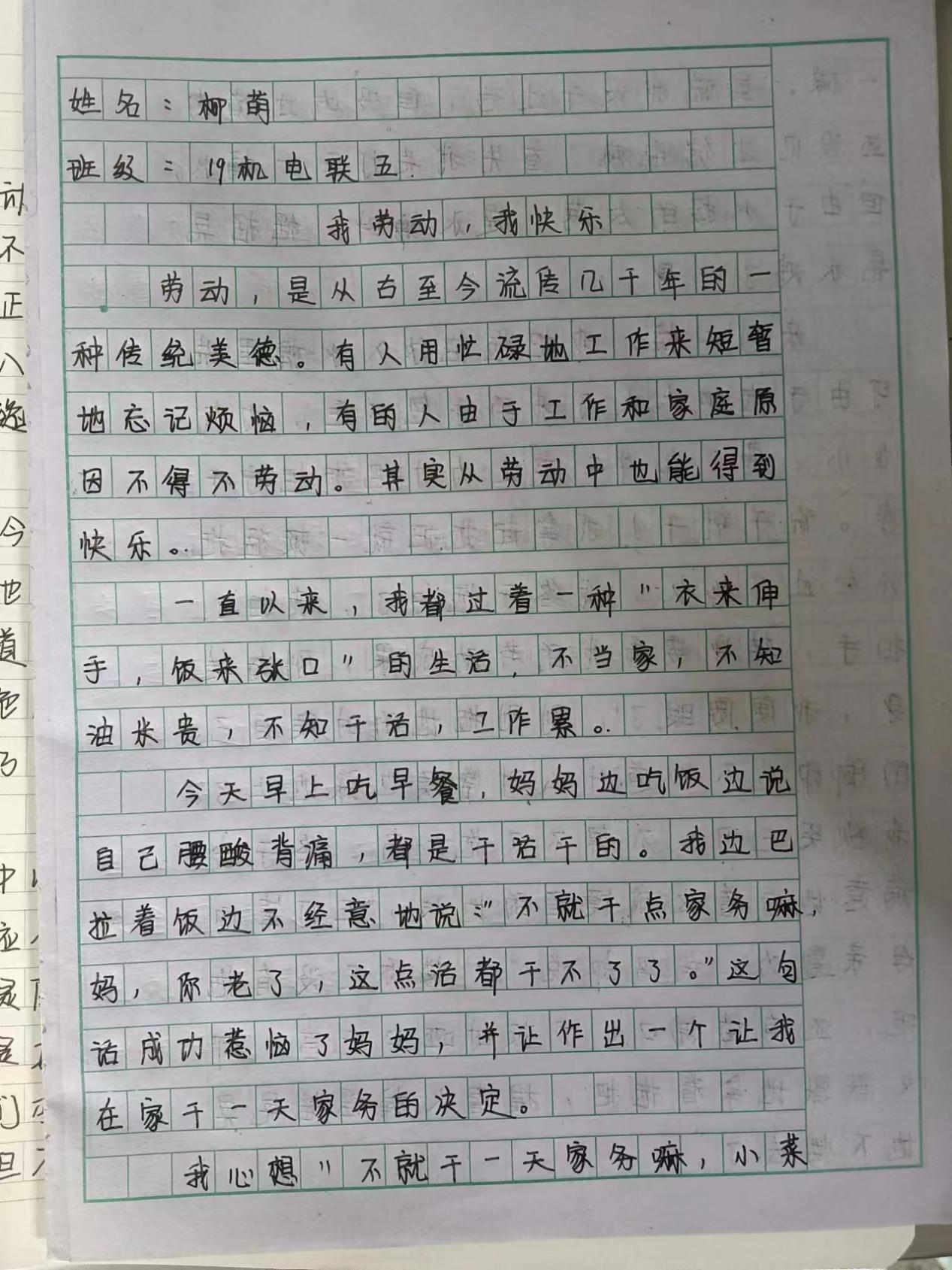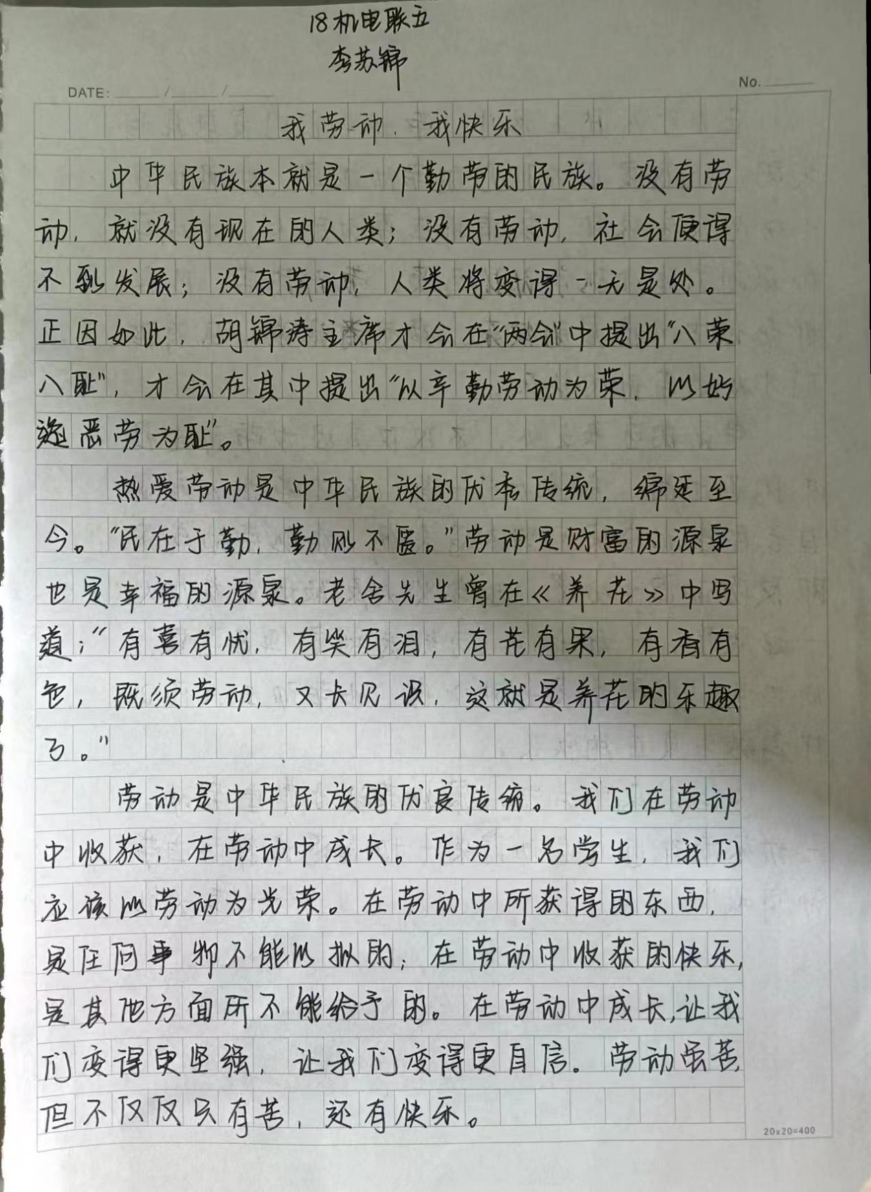 劳动是人类智慧的源泉。人类成为“万物之灵”的根本原因,是因为“手脑并用”的结果,人类自从有了两脚直立的能力,两手便可以自由地做各种事情,劳动多了,人脑自然从多种信息中得到结论,加上语言的辅助,人们渐渐地有了智慧。我系特举办“我劳动,我快乐”为主题的征文比赛,有许多优秀的作品值得欣赏。