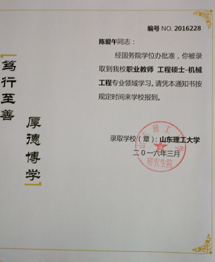 日前,从山东理工大学研究生院传来喜讯,经过GCT全国联考、该校的政治理论与专业理论考试及专业面试,我系陈爱午主任被正式录取为该校2016级研究生,进入该校工程硕士机械工程专业领域学习。 近年来,学校十分重视师资队伍建设工作,出台了一系列政策,鼓励教师参与学历提升教育,仅今年就有10多名教师被各类院校录取。