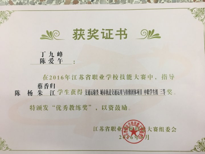 在2016年江苏省职业学校技能大赛中,机电工程系老师指导的三位学生活动交通运输类城市轨道交通运用与检修团体项目中职学生组三等奖,两位老师获“优秀教练奖”。