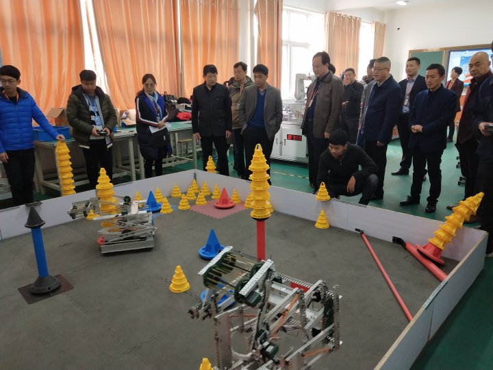 2018年11月15日,市教育局领导班子在学校何晨阳校长带领下,视察我系工业自动化实训基地。视察期间,市局领导实地察看了各实训室的建设工作,观摩了我校VEX机器人战队的竞技比赛,对我系实训基地建设工作和学生取得的成绩表示充分肯定,并对实训室设施设备摆放、文化布置等方面提出合理化建议。实训基地负责人陈爱午主任表示将尽快采取措施,将各项工作落实到位,确保如期建成省现代化实训基地。