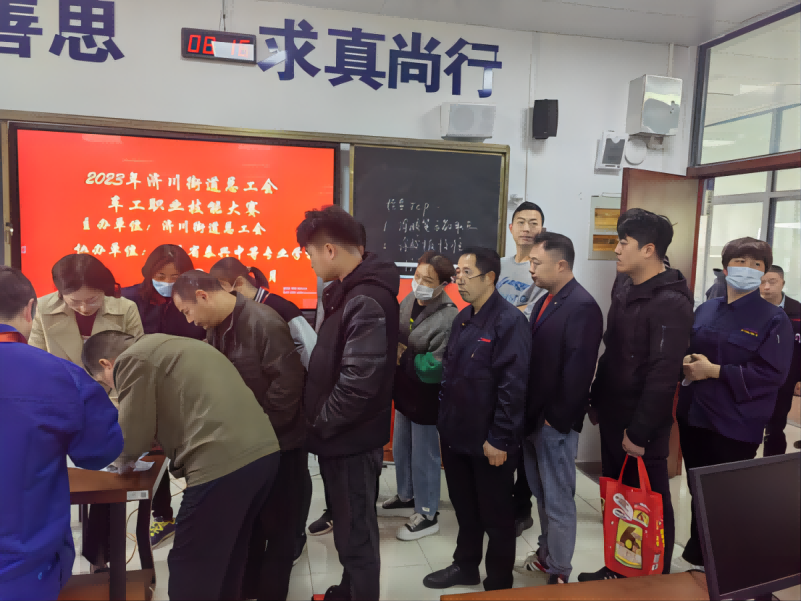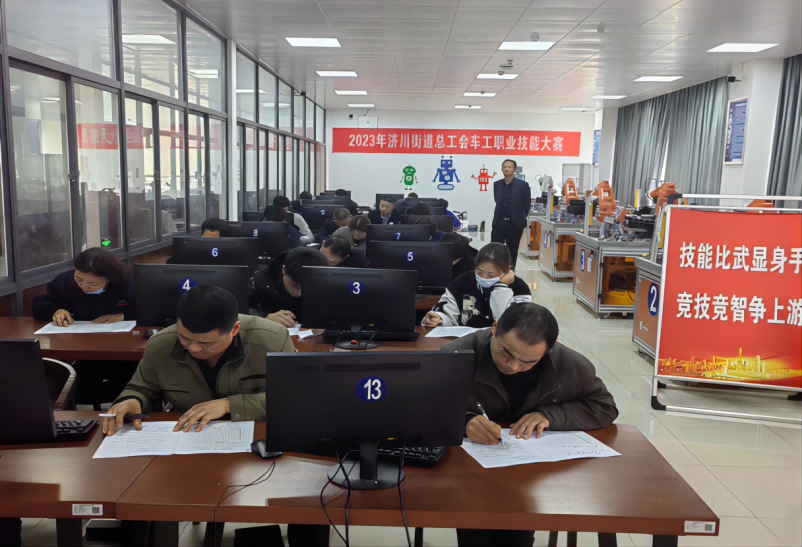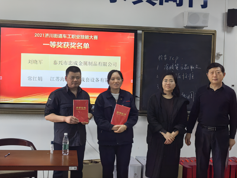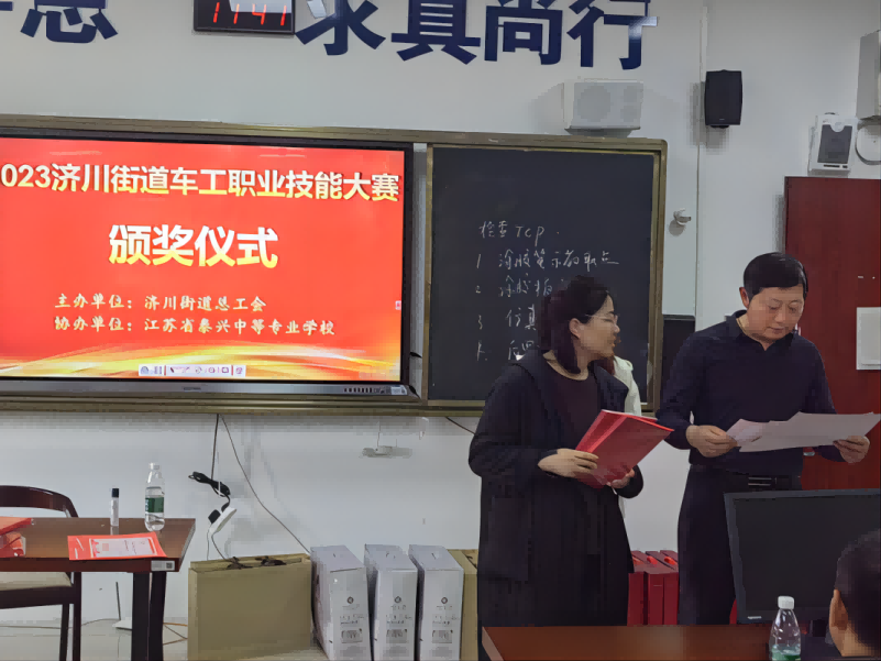 十二点半在机电综合考评中心举行本次大赛的颁奖仪式,泰兴济川街道总工会黄主席对大赛获奖的选手颁发了荣誉证书和奖品。本次大赛取得圆满成功。